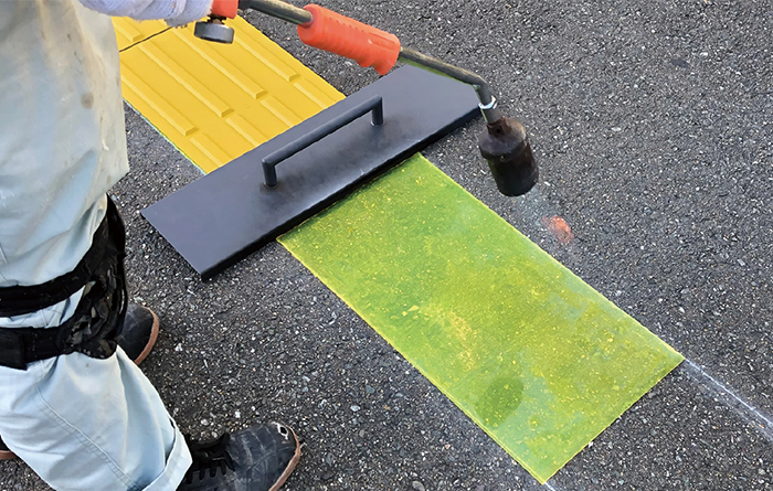 新開発の加熱溶融型接着シートは従来の施工効率約3倍。養生時間約1/3。